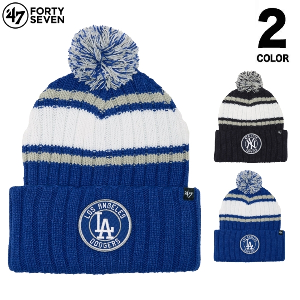 '47 フォーティーセブン から展開する「YANKEESE DODGERS PLATEAU ’47 CUFF KNIT B-PLTCF」。フロントに各チームロゴをサークルロゴ刺繍でデザインしたニット帽。サイドには47ピスネームを装備。ボンボン付きニットキャップで秋冬らしい帽子。柔らかい肌触りが特徴的なかぶり心地も抜群のビーニー。