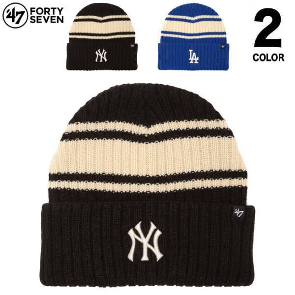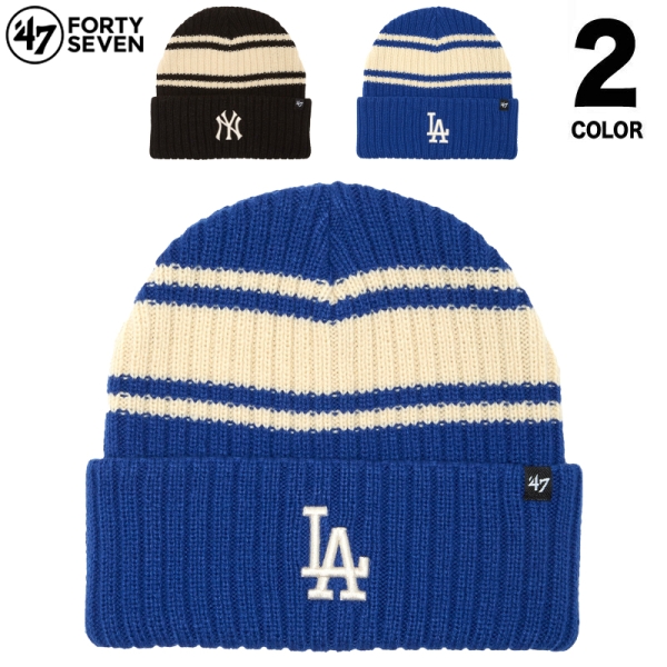 '47 フォーティーセブン から展開する「YANKEESE DODGERS HARBOR STRIPE ’47 CUFF KNIT B-HRBRS」。ボーダーのアクセントに加え、フロントに各チームロゴを刺繍でデザインしたニット帽。サイドには47ピスネームを装備。柔らかい肌触りでかぶり心地も抜群のビーニー。