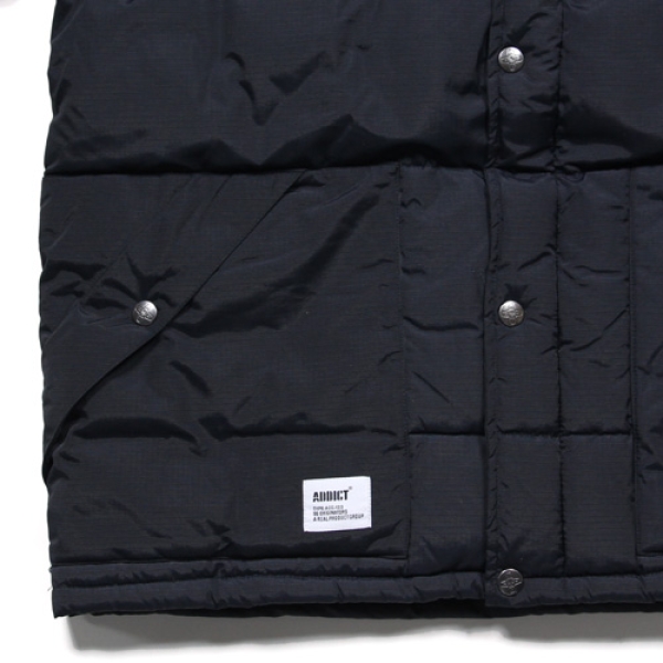 ADDICT(アディクト)から展開する≪2014 AUTUMN/WINTER COLLECTION≫よりADDICTダウンジャケット登場!!!ナイロンリップストップで切替したデザイン性◎ADDICTダウンジャケット。フード部のADICCT刺繍、大きなベローズポケット、アイコンクロス刻印ボタン、レザーワッペン装備。 フード部分の取り外しでスタイルに合わせて使い分け可能。