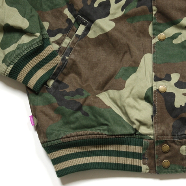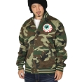 MISHKA(ミシカ)から≪2012 FALLコレクション≫より毎シリーズ大好評バーシティジャケット登場!!今季のモデルはウッドランドカモパターンに大人気『KEEP WATCH』ワッペンをアクセントで施した豪華バージョン。裏地は『KEEP WATCH』をインサートしたペイズリーデザインのキルティング効果でブランドテイスト◎。
