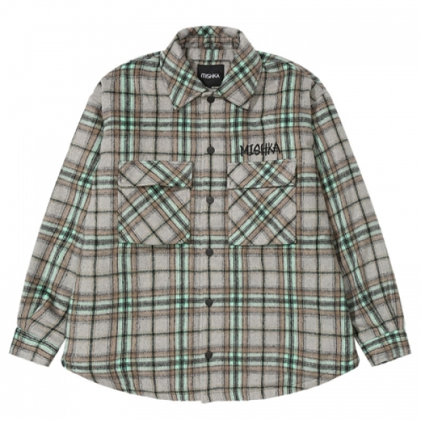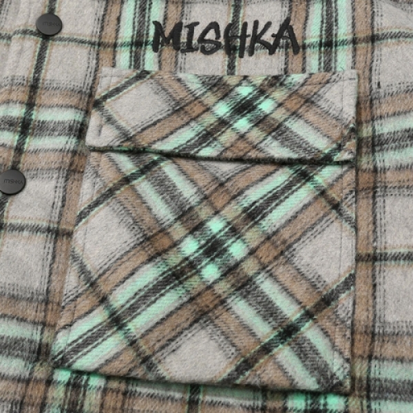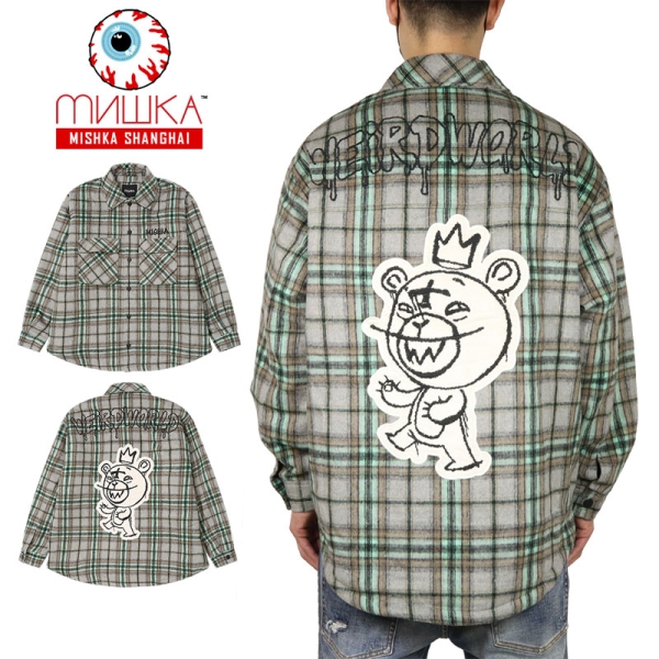 MISHKA ミシカ から展開する「PADDING JACKET」。柔らかなネルシャツ生地の裏地にはキルティング素材を使用し肉厚に仕上げたシャツジャケットが登場。背面にはブランドのアイコニックなBEAR MOPを刺繍ワッペンで堂々と配置。冬らしいチャック柄にブランドネームを刺繍であしらい、秋冬コーデにぴったりのアウター。