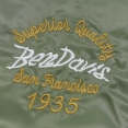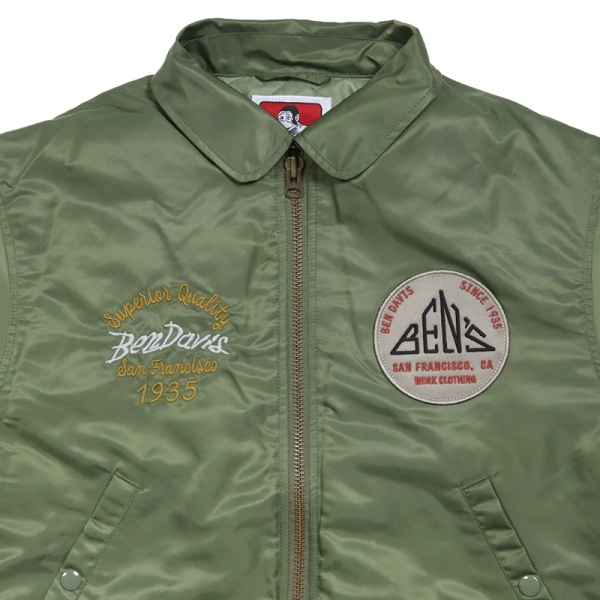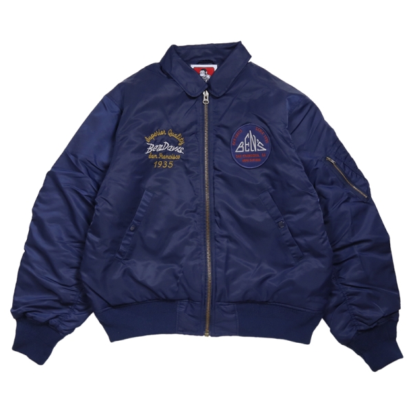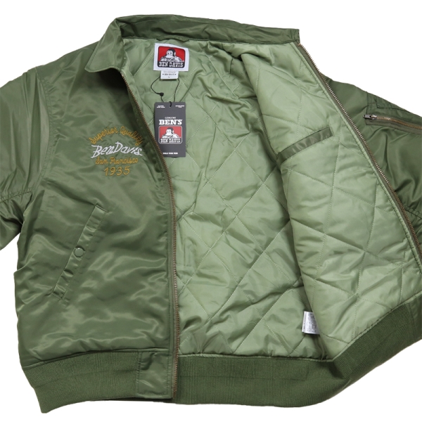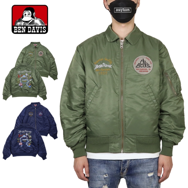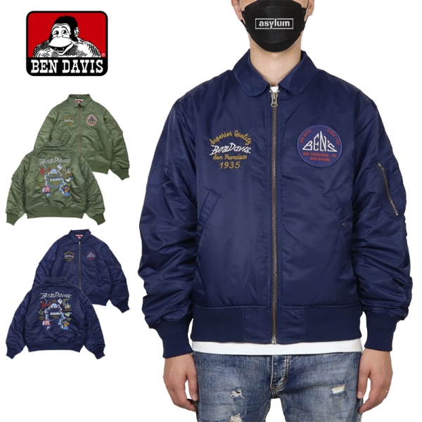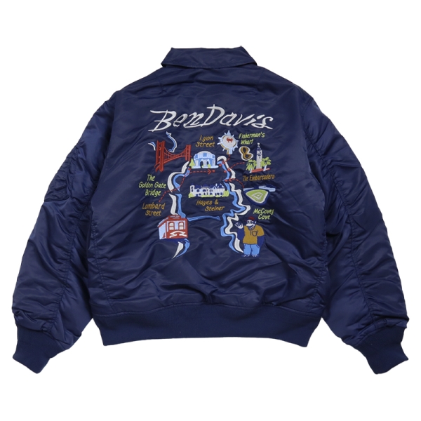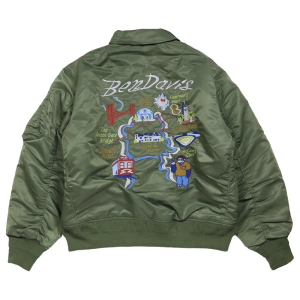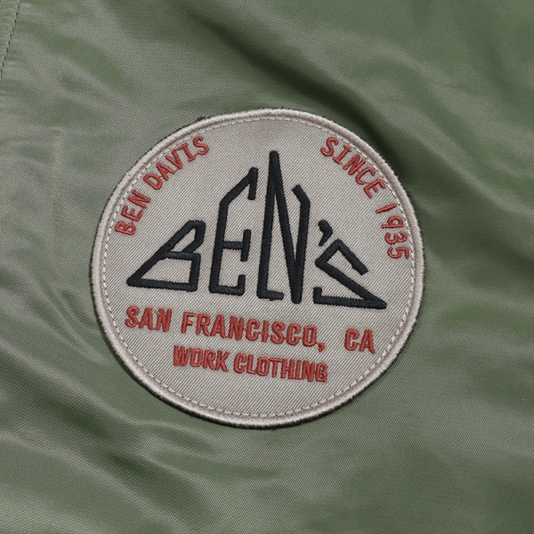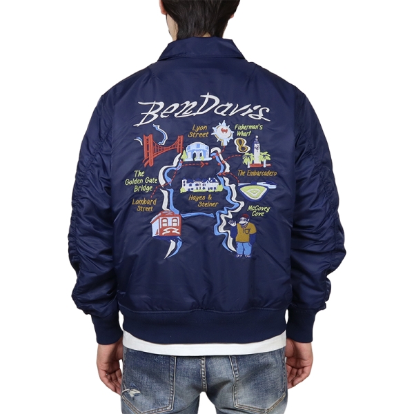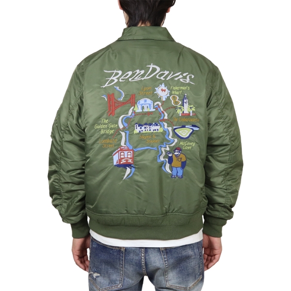 BEN DAVIS ベンデイビス から展開する「SOUVENIR EMB FLIGHT JACKET」。アイコニックなゴリラのエンブレムと共にストリートやアメカジファッションで根強い人気を誇るアメリカン・ワークウェア老舗のBEN DAVISより、背面の刺繍アートワークが魅力のフライジャケットが登場。裏地にはキルティング素材を採用し中綿入りであたたかく、秋冬コーデにおすすめのアウター。トレンドライクなショート丈とボリューム感が好バランスなボンバージャケット。
