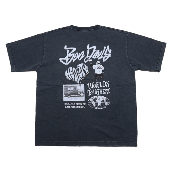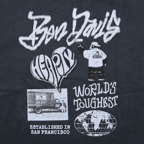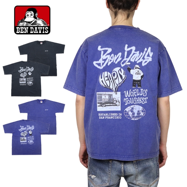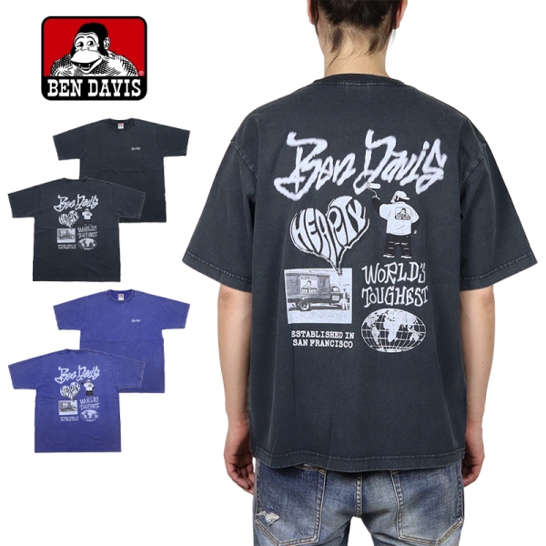 BEN DAVIS ベンデイビス から展開する「TAGGING VNTG TEE」。アイコニックなゴリラのエンブレムと共にストリートやアメカジファッションで根強い人気を誇るアメリカン・ワークウェア老舗のBEN DAVISより、半袖Tシャツが登場。左胸にブランドロゴプリント、バックプリントにはフォトグラフィックなどのモチーフをシルクスクリーンプリントした古着風デザイン。ゆったりとしたサイズ感のビッグシルエット。ほどよく厚手のヘビーウエイト、6.9oz、綿100%で使い勝手良く、メンズからレディースまでおすすめのトップス。