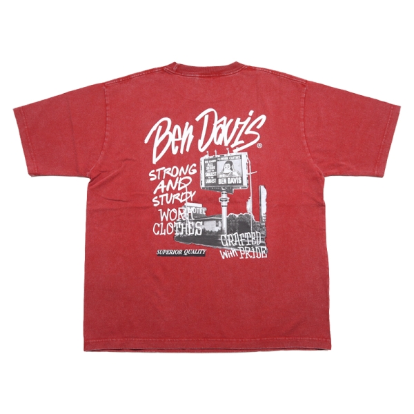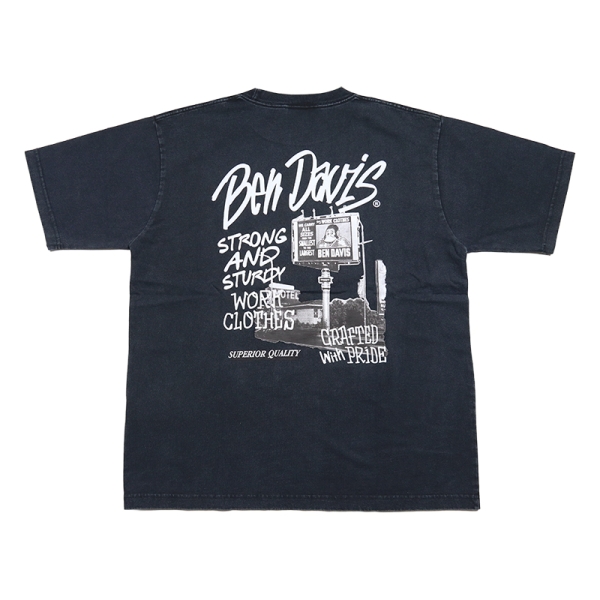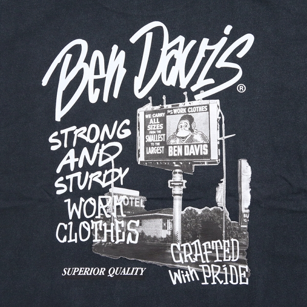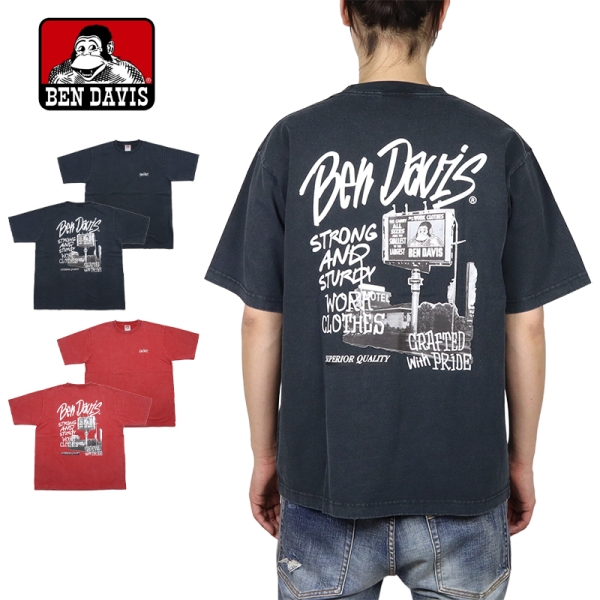 BEN DAVIS ベンデイビス から展開する「ROADSIDE VNTG TEE」。アイコニックなゴリラのエンブレムと共にストリートやアメカジファッションで根強い人気を誇るアメリカン・ワークウェア老舗のBEN DAVISより、ヴィンテージ加工が施された半袖Tシャツが登場。左胸にブランドロゴプリント、バックプリントにはフォトグラフィックを落とし込んだデザイン。ゆったりとしたサイズ感のビッグシルエット。ほどよく厚手でヘビーウエイトな6.9oz、綿100%、タフで使い勝手良く、メンズからレディースまでおすすめのトップス。