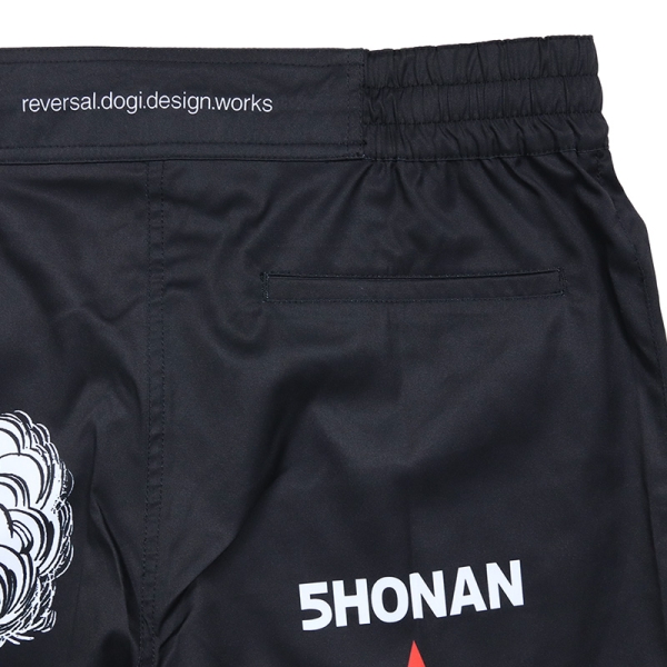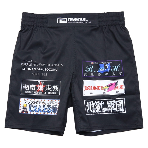 reversal リバーサル から展開する「湘南爆走族×rvddw FIGHT SHORTS」。湘爆ファン必見!! 江口の名言「つっぱらかる」をイメージしたショートパンツが登場。フロントには湘爆、地獄の軍団、ハッスルジェット、ブラッディヒール、そして『じえんとる麺』のフラッグをスポンサーロゴのように配置。ショーツのバックにはクールな江口を落とし込み、コラボ感あふれるデザイン。片側バックポケット付きで、トレーニングからデイリー使い、夏はサーフパンツとしても使用できる万能なハーフパンツ。