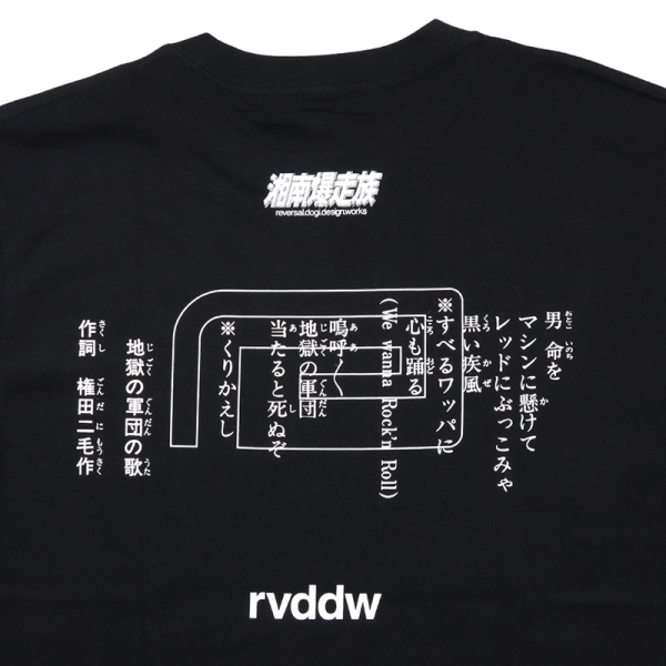 reversal リバーサル から展開する「湘南爆走族×rvddw JIGOKU NO GUNDAN TEE」。湘爆ファン必見!! 江口の永遠のライバルである『地獄の軍団』権田をイメージしたクルーネックTシャツが登場。思わず口ずさみたくなる歌詞を、ブランドお馴染みビッグマークロゴと共にバックプリントに落とし込みコラボ感あふれるデザイン。5.6oz、綿100%で使い勝手良く、インパクト抜群のトップス。
