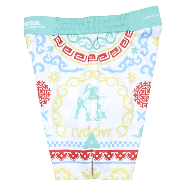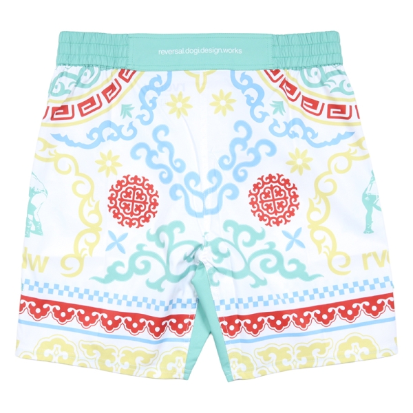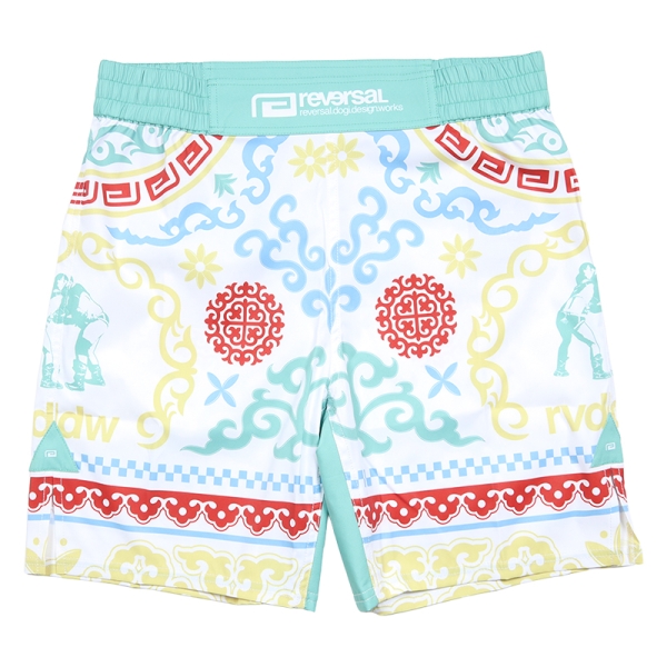 reversal リバーサル から展開する「BOKH FIGHT SHORTS」。モンゴルに古来より伝わる伝統的な立技組技系格闘技「BOKH(ブフ)」をモチーフにした総柄デザインのショートパンツが登場。ストレッチ素材を採用、なおかつ180度開脚パターンを採用することで快適なパフォーマンスをサポート。レギュラー丈、ゴムウエストで動きやすく、ポケットレスのため試合にも出場可能な仕様に。ジムワークやトレーニングにもおすすめのファイトショーツ。