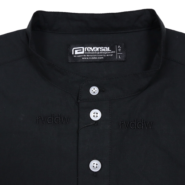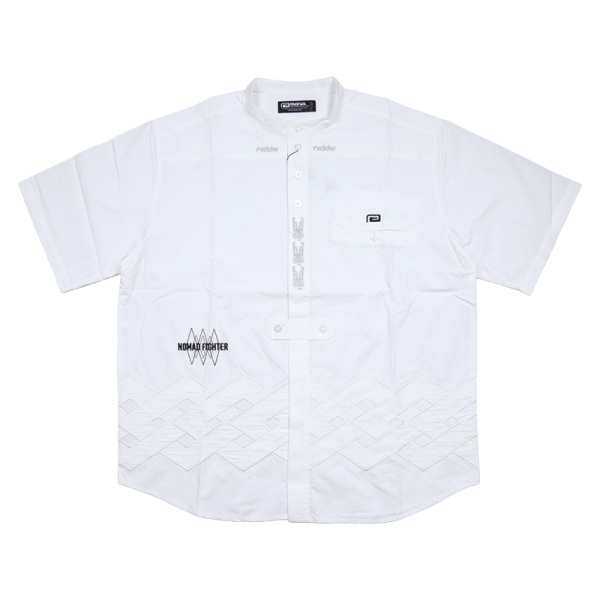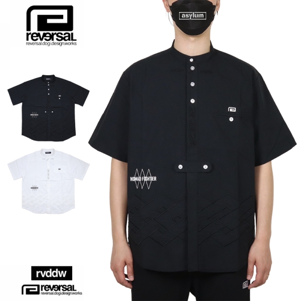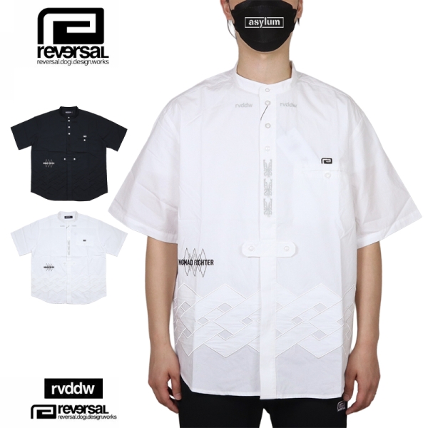 reversal リバーサル から展開する「rvddw TYROL SHIRTS」。民族衣装としての一面も持つチロルシャツに、rvddwのブランドアイデンティティを落とし込んだ半袖シャツが登場。勝守を意味する伝統ある民族柄をさりげない同色刺繍で大胆にパッチワーク。こだわりの刺繍デザインを細部まで配置し、スタンドカラーがこなれた印象を与えるトップス。
