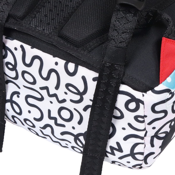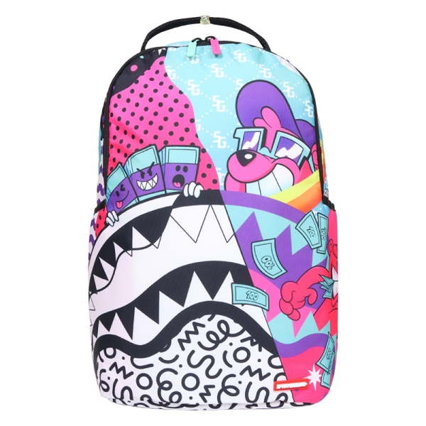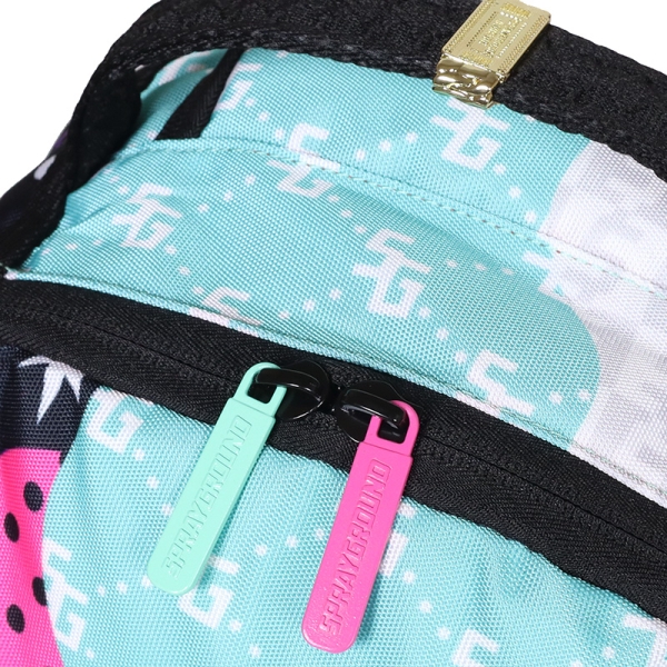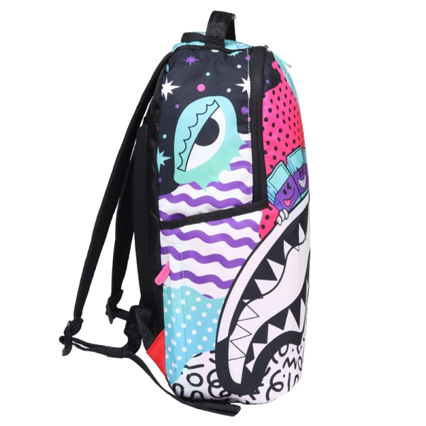 SPRAYGROUND スプレーグラウンド から展開する「STREET ART COLLAGE BACKPACK」。アメリカ発のバックパックブランドから個性的なコラージュデザインが目を引くリュックサックが登場。アイコンのシャーク柄をベースに、ポップなアートワークがコラージュされた総柄デザイン。大きく開閉するファスナーでメイン収納部の荷物の出し入れもスムーズに。両サイドのポケット、リュック上部のサングラス用ポケット、大容量のメイン収納内にはノートPCやタブレットの収納に便利なクッション入りのラップトップスリーブを装備。人間工学に基づいたパッド入りバックパネルと調節可能なショルダーストラップでフィット感にもこだわった大容量リュック。背面パッド下部のファスナーを開ければスーツケースのハンドルに差し込め、キャリーオンバッグとしても使用可能。
