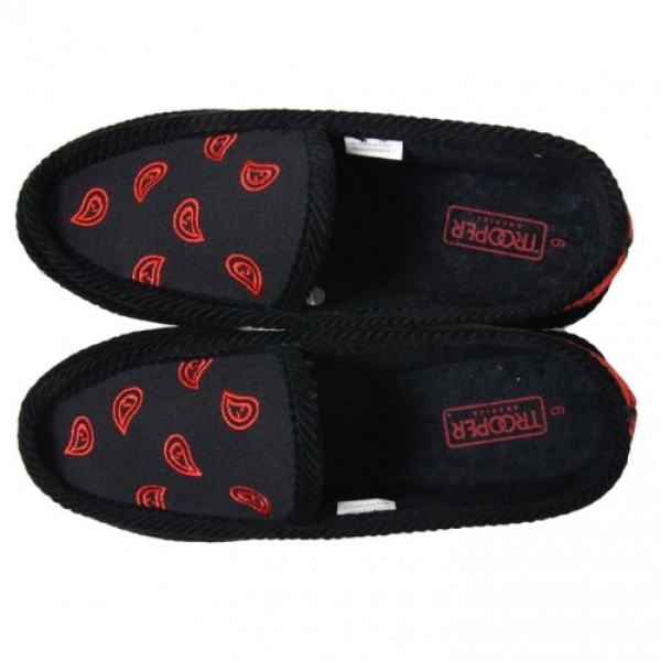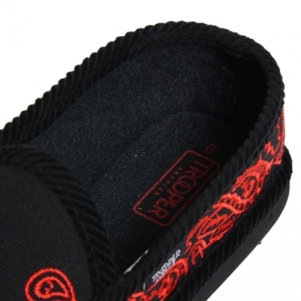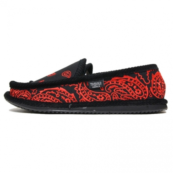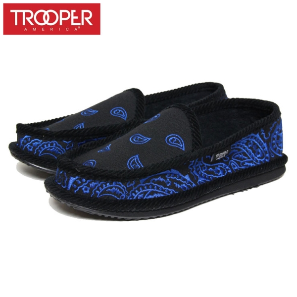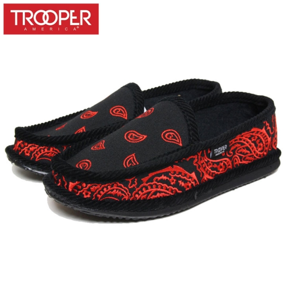 TROOPER AMERICA トゥルーパーアメリカから展開する「SLIP-ON KS-002E」。通常のハウスシューズに比べソール部分が丈夫なゴム素材となるので、外履きにも対応可能。アッパーはコットンキャンバスを使用し、インソールにパイル地を用いクッショニング性、軽量にも優れており素足でも心地良く履けるスリッポン。アイコンであるペイズリー柄が大人っぽい雰囲気で魅力的。
