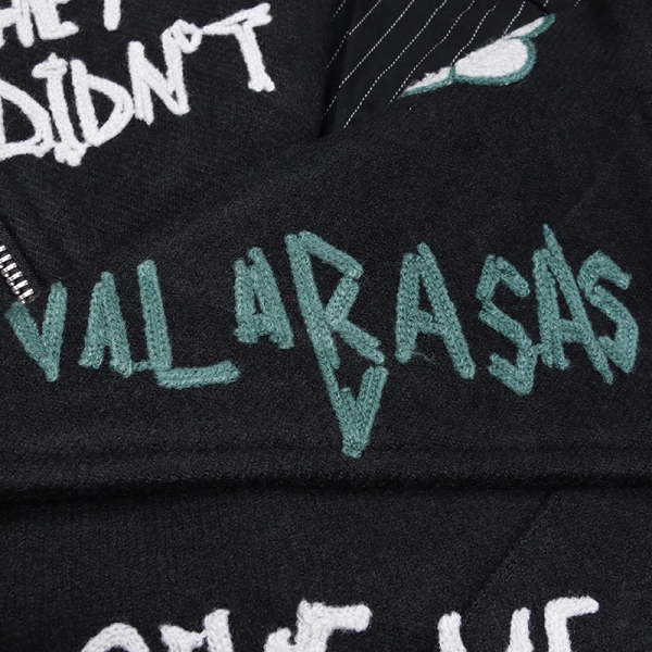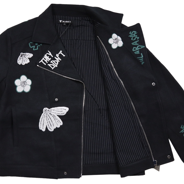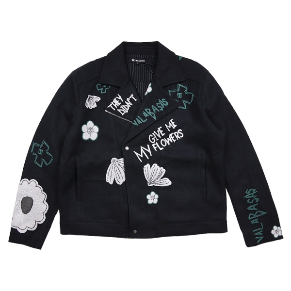 VALABASAS バラバサス から展開する「SELFMADE JACKET」。アメリカ発ストリートウェアブランドから、独自のデザインと計算されたシルエットが特徴のライダースジャケットが登場。上質なポリエステルとレーヨン混紡素材を使用し、「They didn't give me my flowers」という手書き風の刺繍に加え、大胆なブランドロゴと花のモチーフが刺繍で落とし込まれたこだわりのデザイン。シャープな襟と、ほどよくゆったりな着心地の良いフィット感が好バランス。デイリーコーデの主役として、ストリートスタイルに確かな個性をプラスするアウター。
